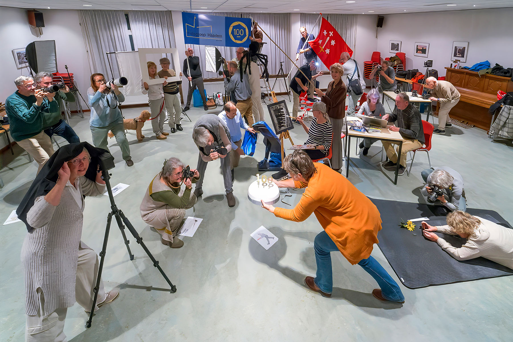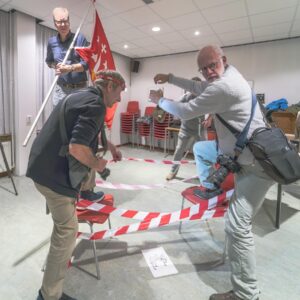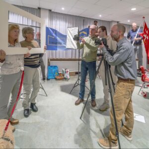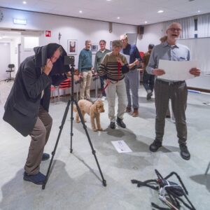 De voorbereidingen voor het jubileumjaar 2026 zijn in volle gang. Eén van de projecten is het maken van een hedendaagse schuttersstuk. We gaan dit groepsportret in februari in de Grote of St. Bavo-kerk maken. Het stuk bestaat bestaat uit verschillende scènes, die een beeld geven van het feestje dat we vieren en de soorten fotografie die we beoefenen. De enscenering is inmiddels bedacht en uitgetekend, maar er moet natuurlijk ook geoefend worden en dat deden we donderdagavond. Verschillende attributen mee, allemaal gepaste kleding aan, en dan maar gaan “staan”. Regisseur Marijke Kots was aanwezig en zorgt ervoor dat we niet alleen staan, maar de scène ook beleven. Een vrolijke activiteit was het, en heel nuttig om te kijken of het overdraagt wat we willen en hoe we de compositie kunnen verbeteren.