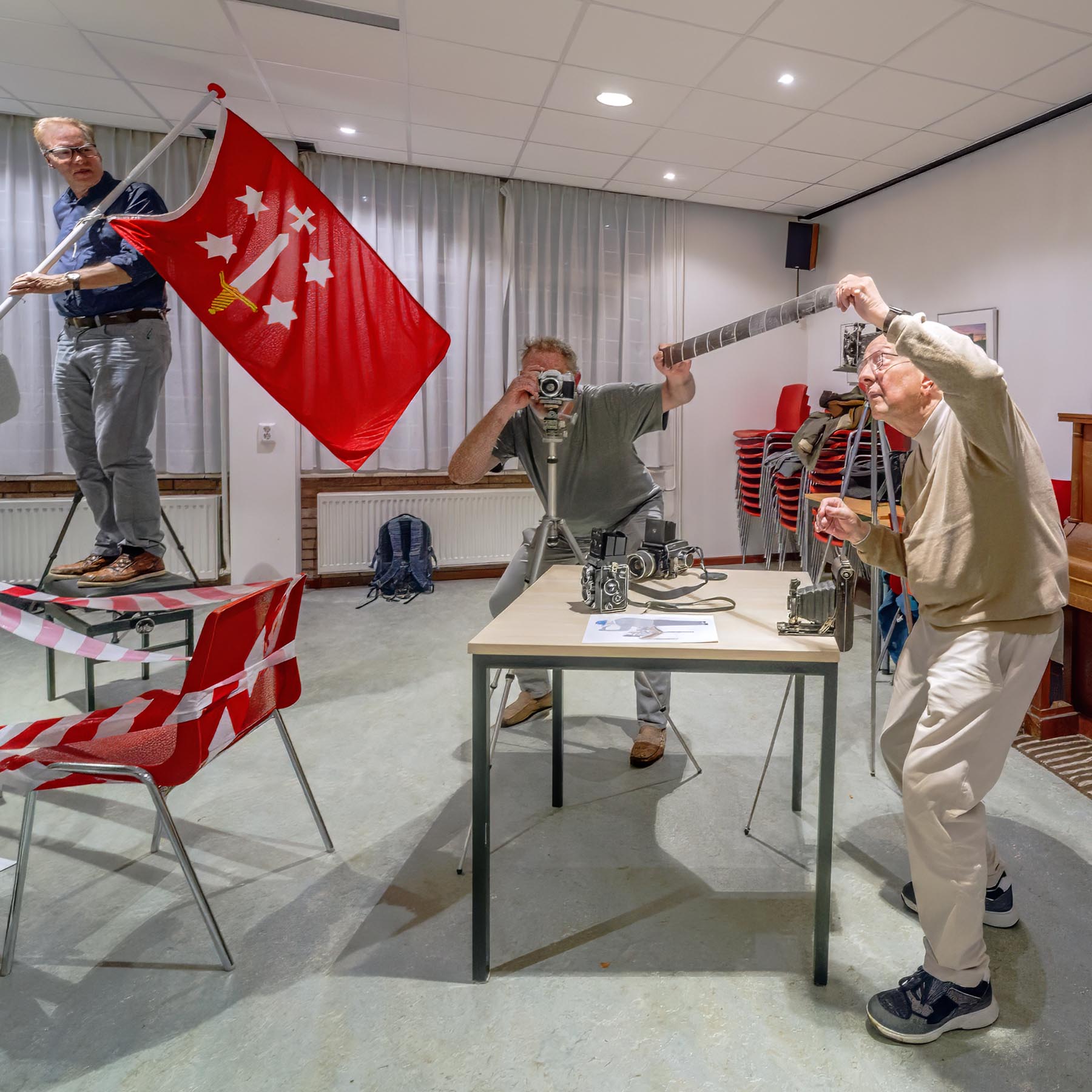 De voorbereidingen voor het jubileumjaar 2026 zijn in volle gang. Eén van de projecten is het maken van een hedendaagse schuttersstuk. We gaan dit groepsportret in februari in de Grote of St. Bavo-kerk maken. Het stuk bestaat bestaat uit verschillende scènes, die een beeld geven van het feestje dat we vieren en de soorten fotografie die we beoefenen. De enscenering is inmiddels bedacht en uitgetekend, maar er moet natuurlijk ook geoefend worden en dat deden we donderdagavond. Verschillende attributen mee, allemaal gepaste kleding aan, en dan maar gaan “staan”. Regisseur Marijke Kots was aanwezig en zorgt ervoor dat we niet alleen staan, maar de scène ook beleven. Een vrolijke activiteit was het, en heel nuttig om te kijken of het overdraagt wat we willen en hoe we de compositie kunnen verbeteren.